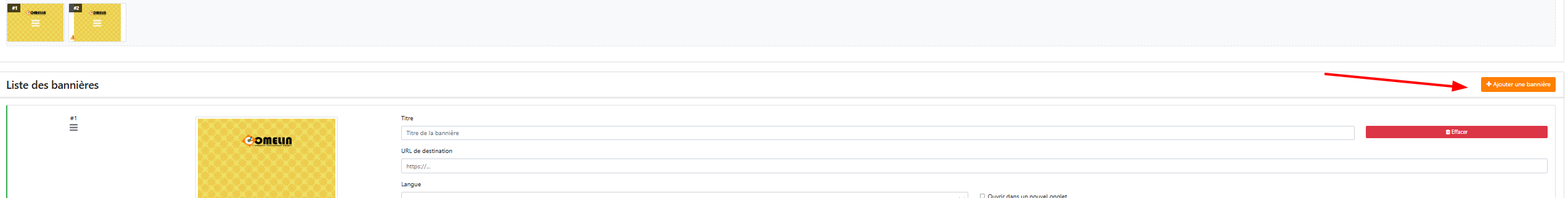 | Ajouter une bannière | Bouton orange + Ajouter une bannière |