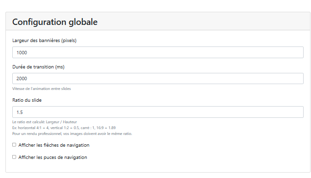 | Ratio du slide | 📌 Définit le ratio largeur/hauteur de l’image. Nous recommandons un ratio 3:2 (équivalent à 1.5 dans l’outil) comme base, car il offre un rendu harmonieux et professionnel, autant sur mobile que sur ordinateur. |